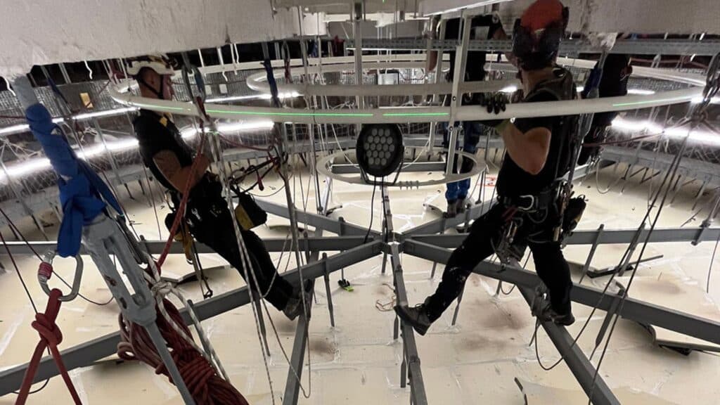 Die Installation wurde von D6 Bell Light (D6BL) durchgeführt, die schnell und sorgfältig arbeiten mussten, da die Glasdecke während der gesamten Dauer mit Hartschaum geschützt werden musste. Das gesamte Projekt wurde in einem sehr kurzen Zeitrahmen von nur 7 Wochen nach Freigabe aller Designkonzepte umgesetzt, sodass Yann auch einen Fertigungspartner benötigte, der schnell liefern konnte.
