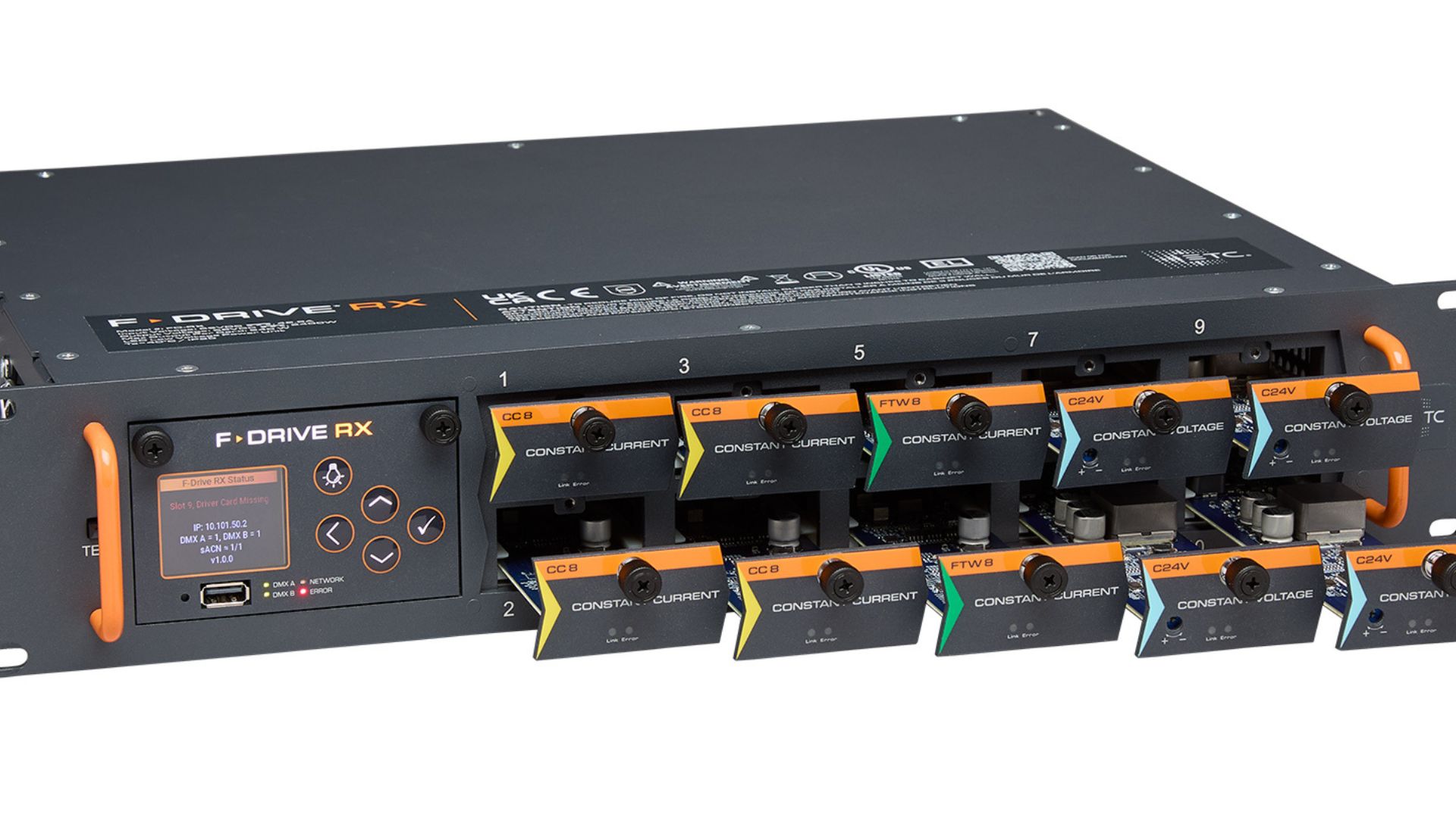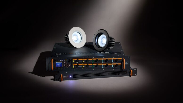F-Drive RX kann – je nach Konfiguration – bis zu 80 Steuerzonen unterstützen indem es die Stromversorgung von LED-Leuchten (unterschiedlicher Hersteller) über Standard-Cat6-Kabel sicherstellt. Mit zehn, während des laufenden Betriebs tauschbaren Ausgangskarten und einer Gesamtleistung von 2800 W bietet das zentralisierte Treibersystem hohen Bedienkomfort und umfangreiche Flexibilität.