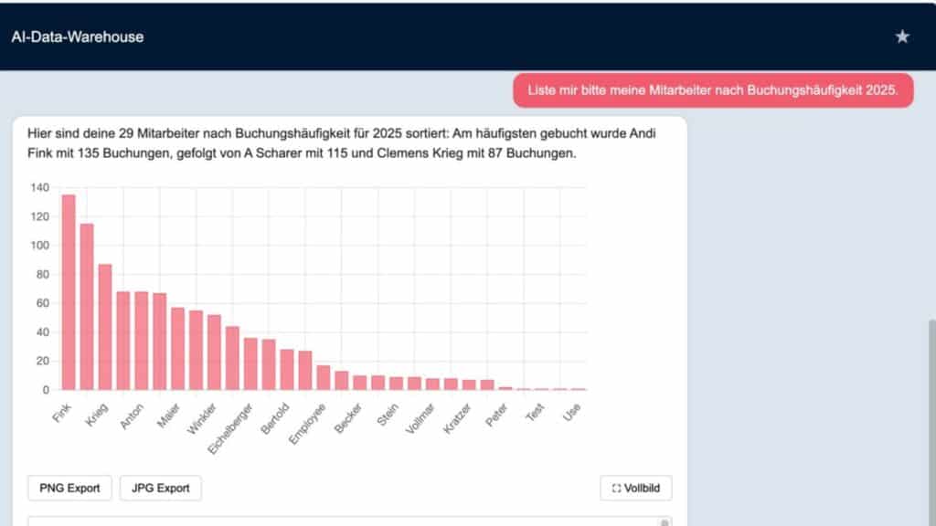 „Viele Kunden wünschen sich schon lange die Möglichkeit, ihr eigenes Reporting direkt in CrewBrain abzubilden – ohne zusätzliche BI-Tools, ohne komplizierte Dashboards und ohne technische Hürden“, erklärt Eva Pennekamp, verantwortlich für den Vertrieb bei CrewBrain. „Mit dem AI-Data-Warehouse schaffen wir genau diese Lösung: Nutzer können Fragen stellen wie „Liste mir die Mitarbeiter nach Buchungshäufigkeit“ und erhalten sofort eine verständliche Antwort – inklusive Auswertung.“