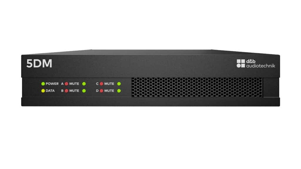 Der 5DM ist ein kompakter 4-Kanal-Class-D-Installationsverstärker für d&b Lautsprecherserien, darunter die E-, xS-, xC- und T-Serie sowie die passiven Modelle der neuen U-Serie. Der Verstärker bietet erweiterte digitale Signalverarbeitung (DSP) für lautsprecherspezifische Konfigurationen, ein Weitbereichsschaltnetzteil mit aktiver Leistungsfaktorkorrektur sowie komplexe Management- und Schutzfunktionen. Mit zwei primären Milan-Streams mit jeweils acht Kanälen, vier analogen Eingängen und flexiblem Routing gewährleistet der 5DM eine effiziente und zuverlässige Verstärkung und lässt sich mühelos in unterschiedlichste Setups integrieren.