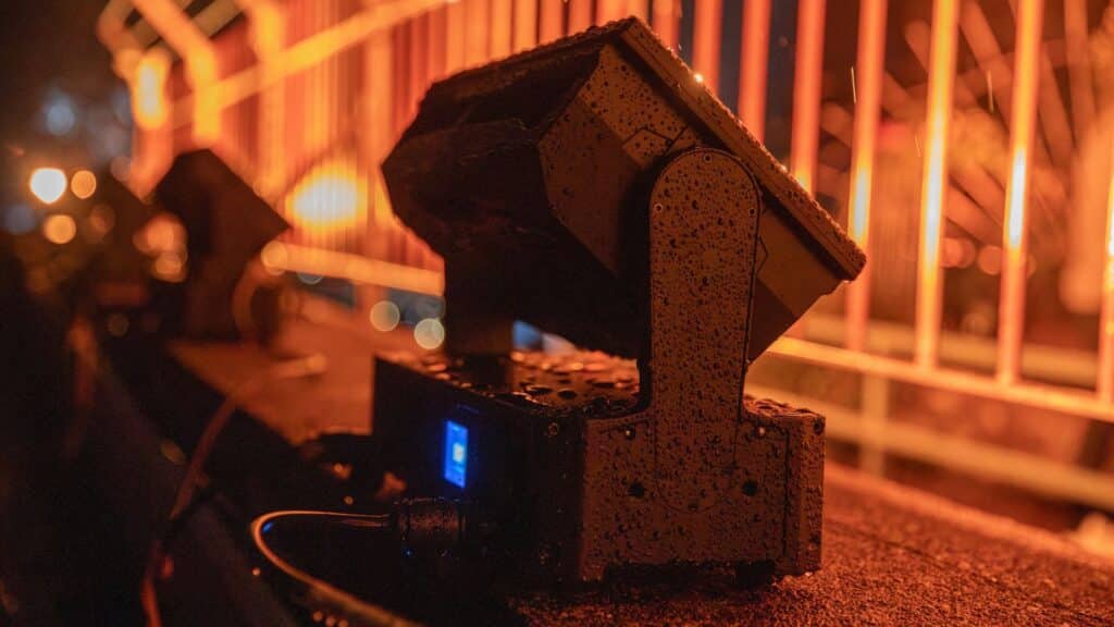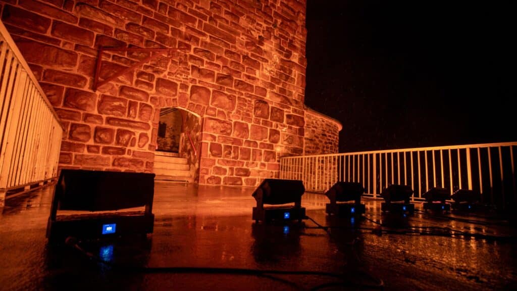 Für die Umsetzung am Turmberg setzte hell begeistert. auf zwölf der neuen Hybrid-Strobes GLP JDC Burst 1, ergänzt durch weitere Scheinwerfer. Sechs JDC Burst 1 wurden bodennah so positioniert, dass sie die südwestliche Seite des Turms vollständig ausleuchteten. Weitere sechs Geräte kamen auf der unteren Aussichtsplattform in rund 16,3 Metern Höhe zum Einsatz und waren nach Nordwesten ausgerichtet, um insbesondere die oberen Turmbereiche in gleichmäßiges, sattes Orange zu tauchen. Durch diese Staffelung ließ sich die komplexe Geometrie des Turms flächig und ausgewogen illuminieren.