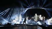 Seit Kurzem verfügt das Gerät über die Schutzklasse IP66. Jason wusste, dass er die gesamte Leistungsfähigkeit des MAD MAXX CW benötigen würde: Zwölf Movinglights, die von der Bühnenfront in den Himmel feuerten, um gegen die massive Szenerie anzukommen – inklusive einer 46 x 18 Meter großen Videowall. Die kräftigen Beams kreuzten sich vor einer künstlichen Stadtsilhouette, die das Publikum begeisterte. „Wir haben sie am Fuß der Skyline platziert, um große Skytracker zu imitieren. Durch die Dimensionen im Verhältnis zum Bühnenbild wirken sie gigantisch und lassen die Stadt lebendig erscheinen. Ihre Reichweite deckt die gesamte Länge eines Stadions ab – das ist wirklich exzellent.“