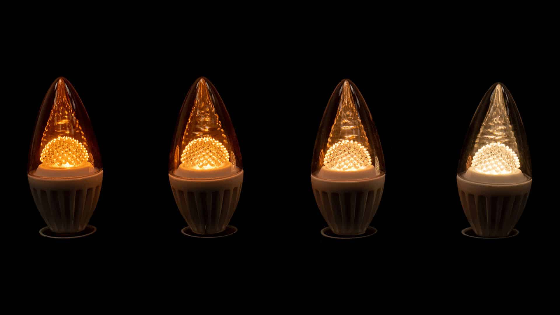 Zentraler Bestandteil der Installation sind die GDS Lamps in Kerzenform mit klarem Glaskörper und E14-Sockel. Mit 490 Lumen bei lediglich 4,2 Watt ersetzen sie klassische 28 Watt Halogenleuchten und erzeugen durch ihre spezielle Optik eine homogene Lichtverteilung mit überzeugendem Kerzencharakter. Entscheidendes Merkmal ist das Fade-to-Warm-Verhalten, bei dem sich die Farbtemperatur beim Dimmen vom warmweißen Ausgangswert von 3.000K in den deutlich wärmeren glühlampenähnlichen Bereich von 1800K verschiebt.